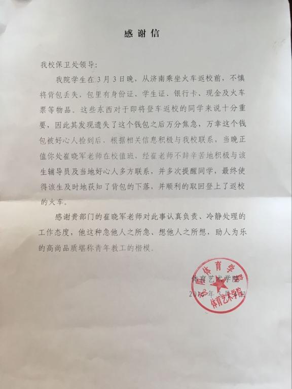 3月3日晚,体育艺术学院一名学生在济南乘车返校期间不慎将背包丢失,背包内有身份证、银行卡、现金、火车票等贵重物品。好心人拾到后与保卫处当日值班干部崔晓军同志取得了联系。崔晓军同志将此信息及时通知该生所属辅导员,并积极帮助学生与拾到人取得联系,最终寻回失物。