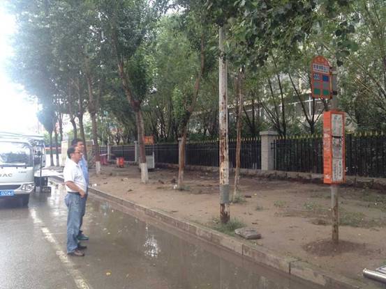 我校北门外333公交车站双向停车区均距离校门左右不足50米,经常出现上下车人员与学生外出人员堵塞校门的情况。我处与区综治办、区交警大队、公交集团多次沟通协商,日前,终于将333公交车北侧停车站向西移20米,南侧停车站向西移100米远离校门,从根本上解决了333公交车在校门前停车导致车辆拥堵的局面。