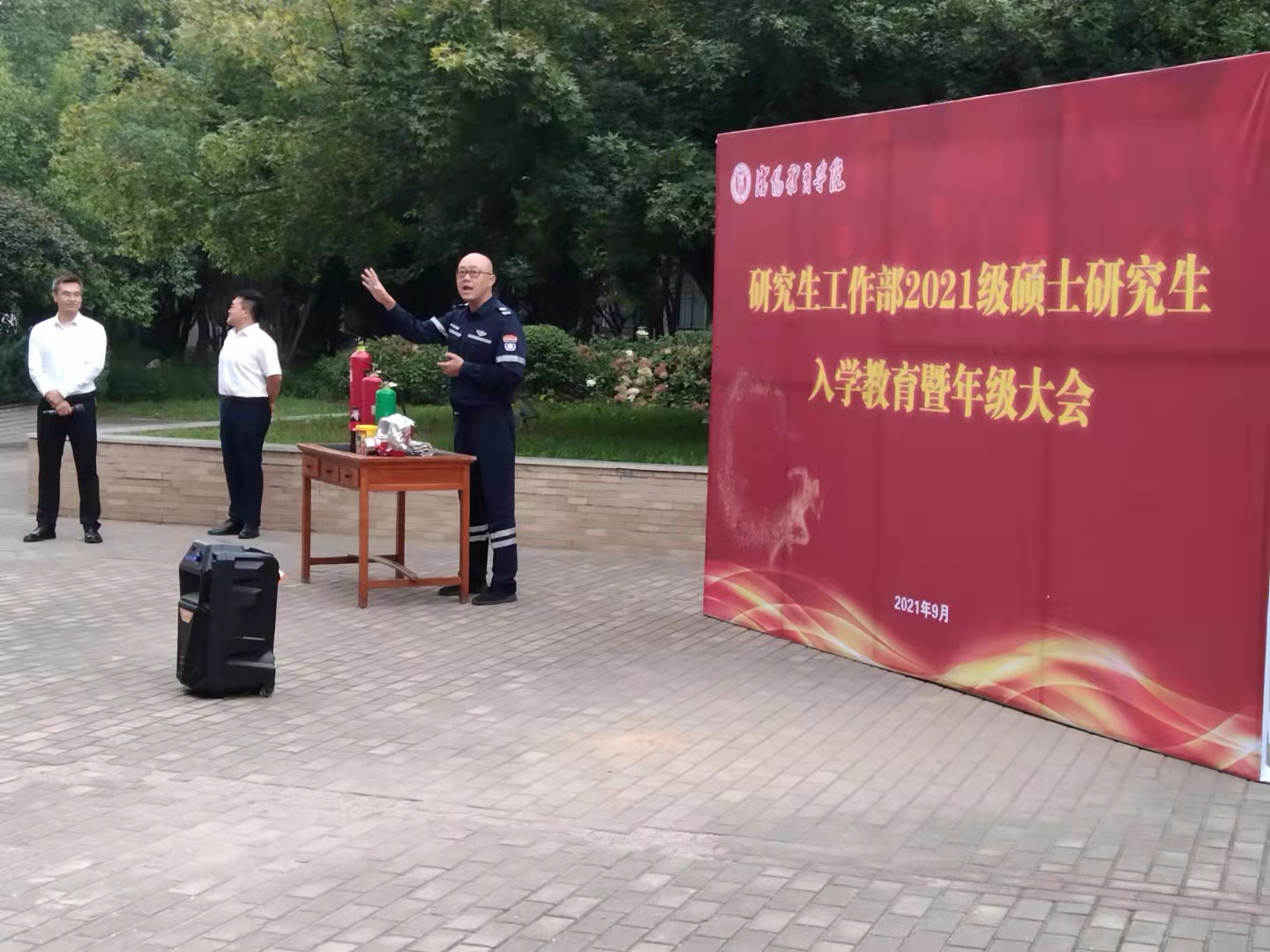 9月18日下午5点,在研究生宿舍区,保卫处消防科科长白宇对全体研工部新生及辅导员进行了校园安全培训。分别从校园综合治安、防诈骗、禁毒品、消防常识、应急疏散、危险自救等方面开展理论培训并进行操作示范。
