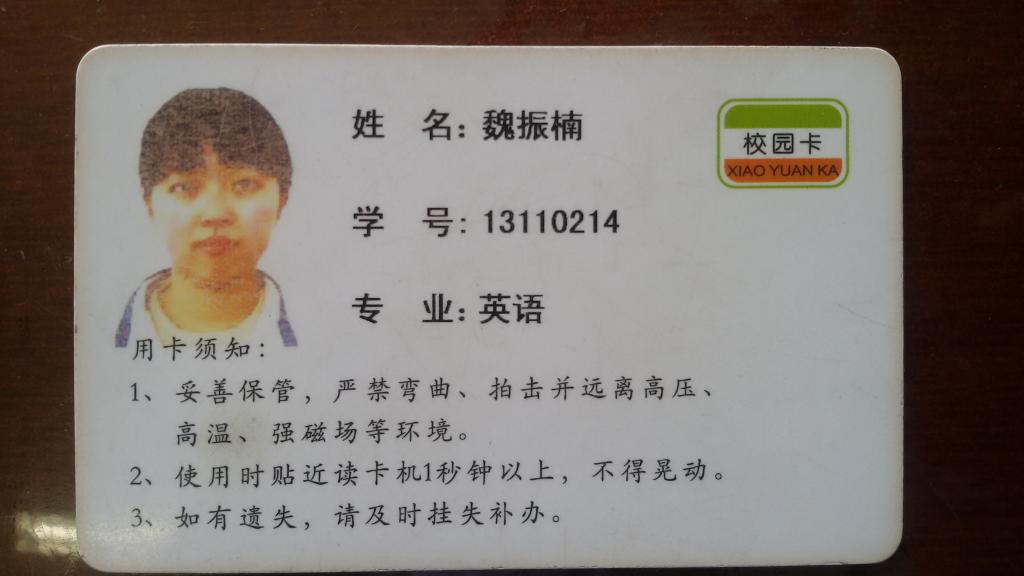 6月4日早上,一位热心环卫工作人员,在清扫校外环境卫生时,捡到我校13级英语专业魏振楠同学的校园卡。现已交由保卫处暂管,请该同学到保卫处领取本人校园卡。
