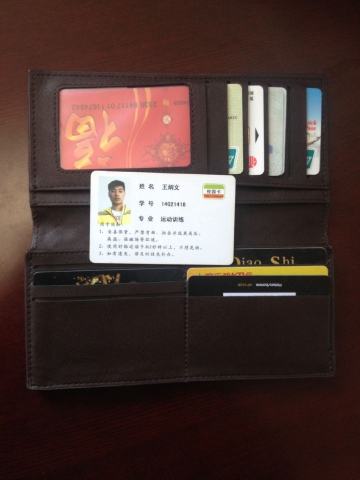 3月10日早8:30,环卫人员拾到咖啡色钱夹一个交到保卫处。内有运动训练14级学生王炳文的校园卡、身份证、中国银行、建设银行、中信银行等多种证件,请王炳文同学到保卫处领取本人丢失的钱夹。